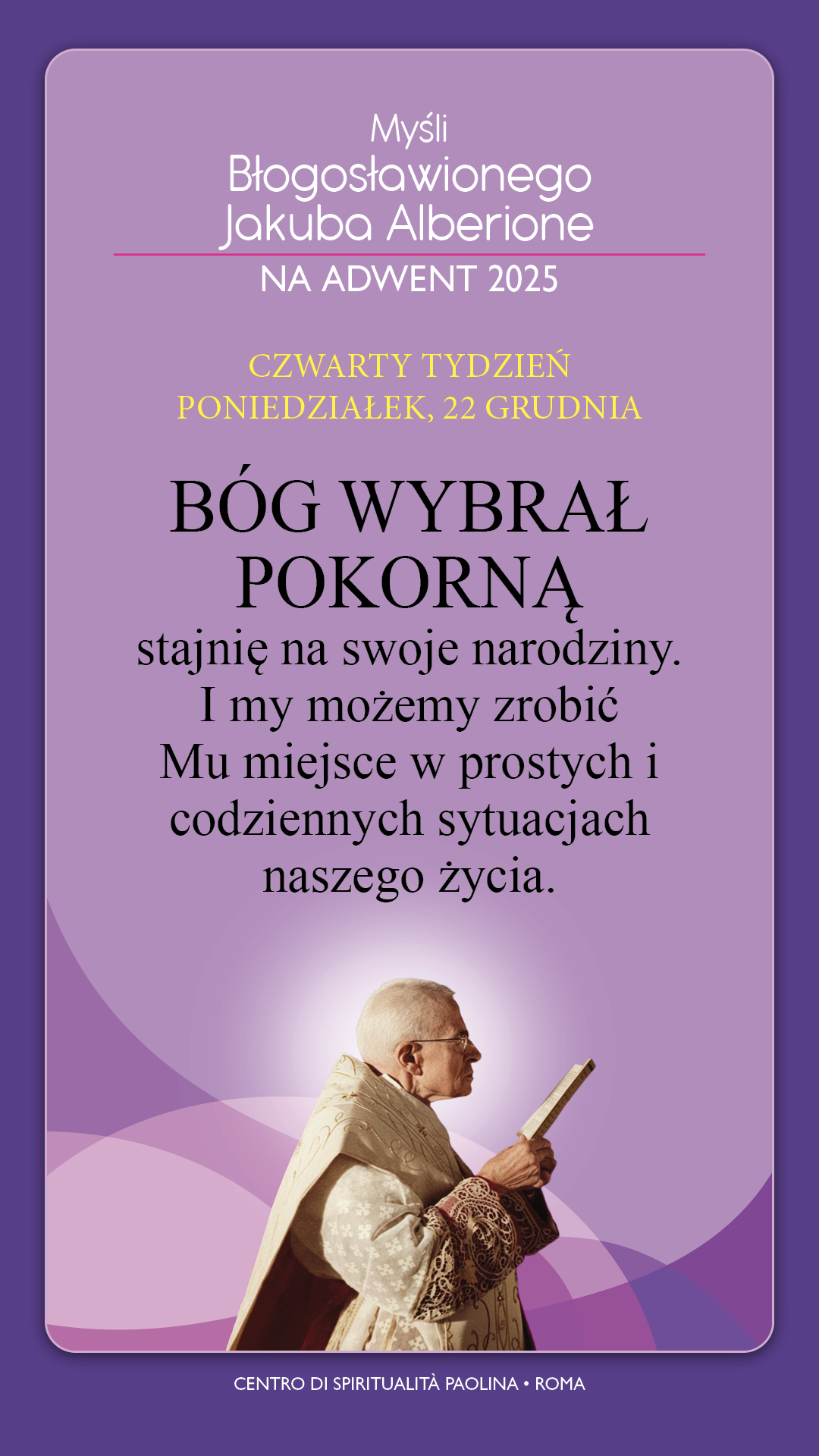 «Wielbi dusza moja Pana i raduje się duch mój w Bogu, Zbawicielu moim. Bo wejrzał na uniżenie swojej Służebnicy. Oto bowiem odtąd błogosławić mnie będą wszystkie pokolenia, gdyż wielkie rzeczy uczynił mi Wszechmocny, a Jego imię jest święte.