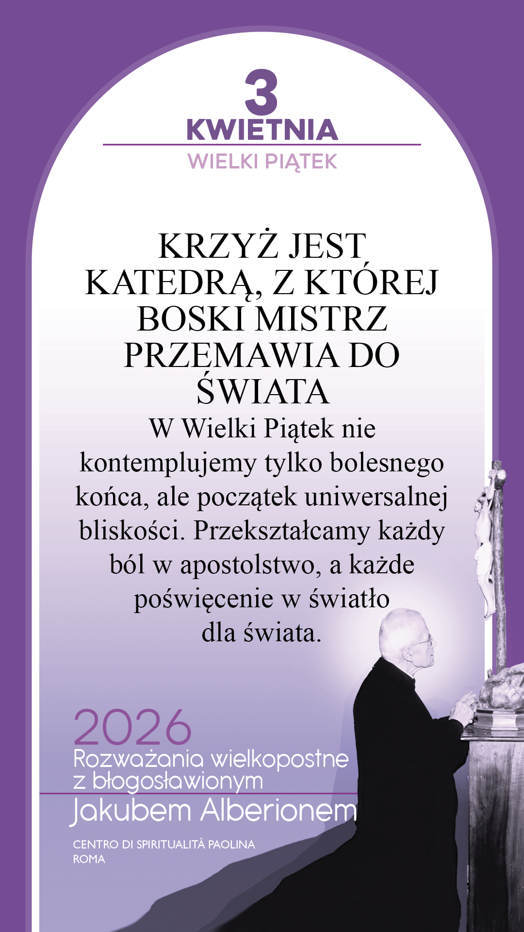 W liturgii Wielkiego Piątku Kościół czyta opis męki Pańskiej według św. Jana. Ukazuje on proces Jezusa przed najwyższymi kapłanami Annaszem i Kajfaszem oraz przed Piłatem, który nawet usiłuje Go uwolnić. W trakcie procesu Pan Jezus wyraźnie potwierdza, że jest mesjańskim królem, a Jego królestwo nie jest z tego świata. Święty Jan umieszcza w opisie męki Pańskiej także przejmującą scenę przedstawienia ludowi poniżonego i ubiczowanego Jezusa (tradycyjnie nazywaną Ecce Homo – Oto Człowiek). Ukrzyżowany Jezus daje Maryi Jana za syna, a Janowi Maryję za matkę. Jan wziął Maryję do siebie (po grecku eis ta idia), czyli do tego wszystkiego, co stanowiło jego świat, do swojego życia. Warto zwrócić uwagę na kolejność: najpierw uczeń powierzony jest Matce, a potem Matka uczniowi. Pan Jezus na chwilę przed oddaniem ducha Ojcu powierza nas Maryi, aby była dla nas Matką, a zaraz potem daje nam Maryję, abyśmy przyjęli Ją do swojego życia, do domu, do swoich najbardziej osobistych spraw.